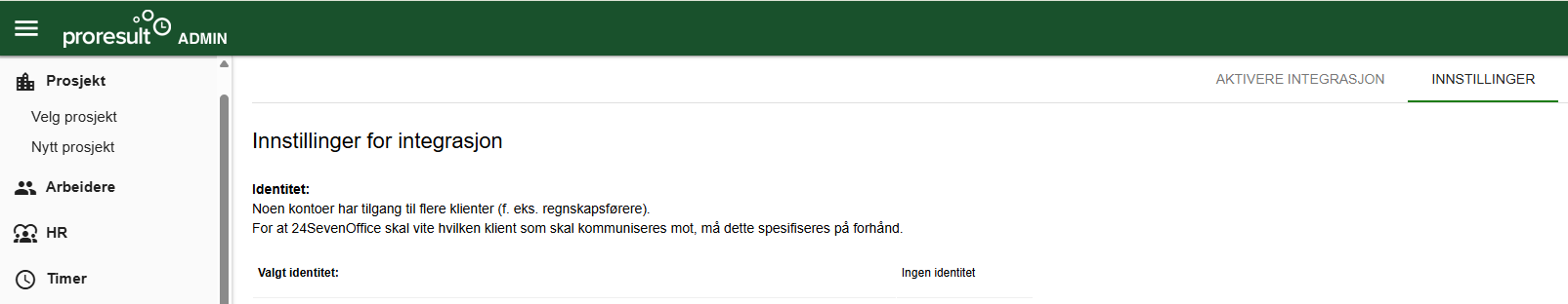 OBS: Hvis det allerede finnes kunder, ansatte eller prosjekter i 24SevenOffice, kan det oppstå duplikater ved aktivering av integrasjonen. Kontakt Proresult før du aktiverer automatisk overføring, slik at dataene synkroniseres korrekt.