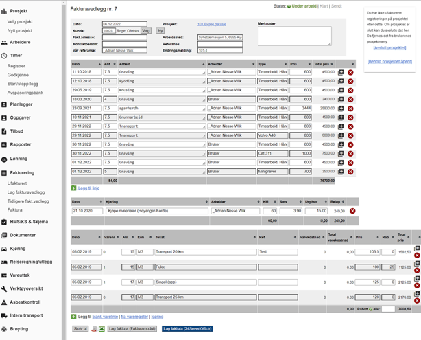 Når du er klar til å fakturere et prosjekt (eller delfakturere), oppretter du først et fakturavedlegg i Proresult basert på prosjektets fakturagrunnlag. Når vedlegget er klargjort, kan du enkelt overføre det som ordre til 24SevenOffice ved å klikke på "lag faktura (24SevenOffice)" nederst i vinduet.