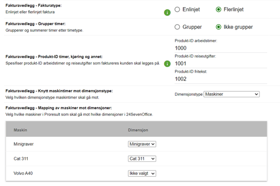 Fakturavedlegg – Produkt-ID timer, kjøring og annet: Her setter du inn varenummeret som skal brukes i 24SevenOffice ved henholdsvis timelinjer, transportlinjer (km, bomring, andre utgifter), og fritekstlinjer i fakturalinjene. Merk at alle linjer på faktura i 24SevenOffice må knyttes mot et varenummer. Du står fritt til å velge hvilke varenummer som skal brukes.