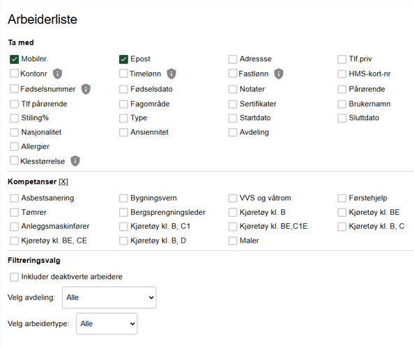 Dette er en meny for filtrering og visning av arbeiderlisten, hvor du kan angi hvilke opplysninger som skal vises, for eksempel mobilnummer, e-post og HMS-kort, samt filtrere etter avdeling og arbeidstype.