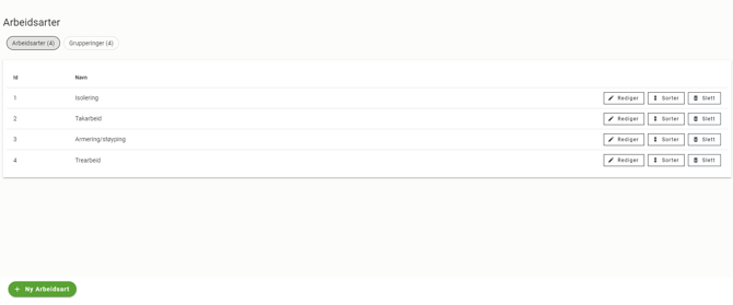 Gruppering gir deg mulighet til å legge flere arbeidsarter under samme gruppe. Når du tar i bruk arbeidsarter i systemet, vil du finne den igjen i gruppen du har lagt arbeidsarten i.