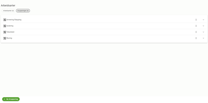 På landingssiden til gruppering kan administrator se de overordnede gruppene. Ved å klikke på gruppene kan administrator se tilhørende arbeidsarter og undergrupper.