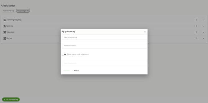 Når du klikker på «ny gruppering», åpnes et dialogvindu hvor du kan angi navn på den nye grupperingen og eventuelt dens undernivå. Dersom du oppgir navnet på en eksisterende gruppering, vil modulen automatisk knytte den nye arbeidsarten til den aktuelle gruppen. Alle undergrupper og tilknyttede arbeidsarter vil deretter vises samlet under samme kategori.