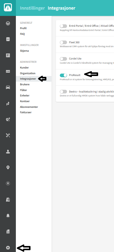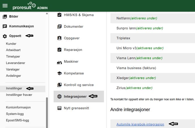 I Proresult aktiveres Automile under Oppsett → innstillinger → Integrasjoner → Automile.