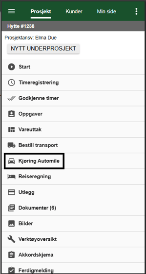 Når integrasjonen er aktivert vil det komme opp et menyvalg som heter "Kjøring Automile" i prosjektmenyen i appen.
