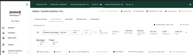 Å benytte biblioteket er den mest effektive måten å arbeide i programmet på. Ved opprettelse av en kalkyle kan du enkelt hente inn ferdige bygningsdeler, eller legge til et ferdig delprodukt når du arbeider med en spesifikk bygningsdel. Dersom du ønsker å bytte ut et delprodukt, er det som regel lettere å finne det du trenger i biblioteket enn å bygge det opp manuelt. Her finner du varer som allerede er tilpasset med korrekt monteringstid, og forbruk samt svinn er hensyntatt i mengde per enhet.
