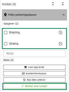 For hvert enkelt område krysser du av for utført arbeid og avslutter hvert område ved å trykke “markert som fullført”.