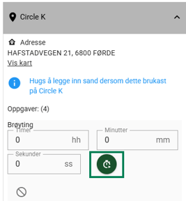 For områder hvor medgått tid skal registreres, benyttes stoppeklokken som startes og stoppes ved begynnelse og avslutning av brøytearbeidet. Det er også mulig å manuelt justere og overskrive registrert tid ved behov.