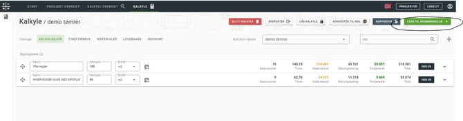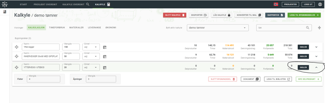 Når du har etablert en kalkyle og justert faktorene kan du legge inn en bygningsdel.