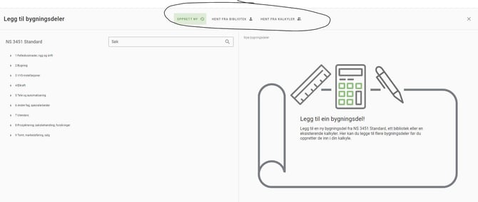 Du kan videre velge om du vil bygge opp bygningsdelen selv (opprett ny) eller om du vil hente fra bibliotek eller fra en tidligere kalkyle.