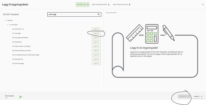 Uansett om du oppretter ny eller henter fra bibliotek eller tidligere kalkyle så kan du benytte søkefeltet for å lettere finne riktig bygningsdel og du klikker legg til og deretter opprett.