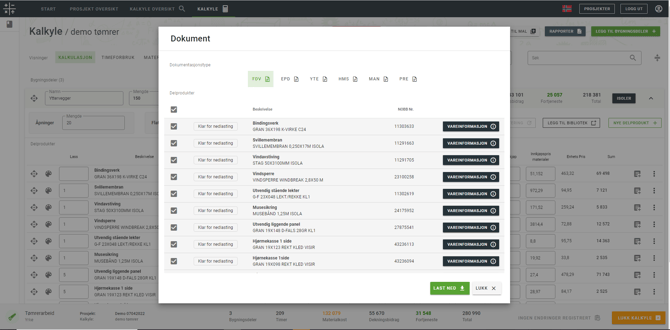 Under knappen “DOKUMENT” på bygningsdelen får du opp et valg der du kan laste de forskjellige varedokumentene ned på mapper på din maskin. Dokumentene kan videre hentes opp i prosjektstyringsverktøy. Du kan angi hvilke varer i bygningsdelen som skal genereres til mappen i de forskjellige dokumentkategoriene