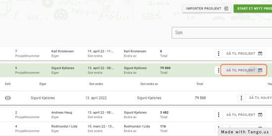 2. Trykk på "gå til prosjekt" til høyre på linjen