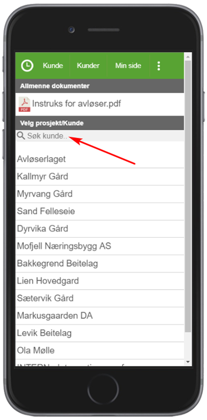 Du kan søke etter deler av navn på kunde i søkefeltet.