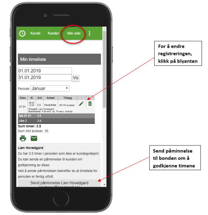 Nå er timene registrert. Men det er viktig at du også sender påminnelse til bonden om å godkjenne timene når du er ferdig å registrere timene for en lønnsperiode (se neste side).