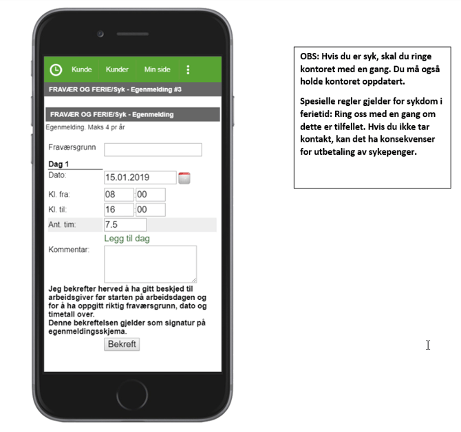 I kundemenyen - velg: "fravær og ferie" og riktig kategori fravær:
