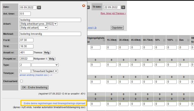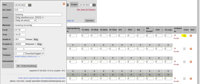 Hvis en timeføring må korrigeres som følge av feilregistrering, velg feltet «endre». Utfør nødvendige endringer og bekreft ved å trykke «OK – endre timeføring».