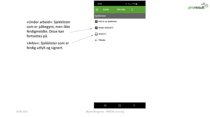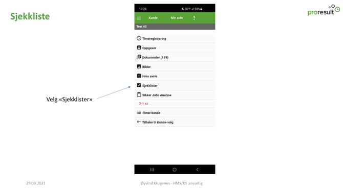 Her vises det hvor brukeren finner “Sjekklister” i app delen.