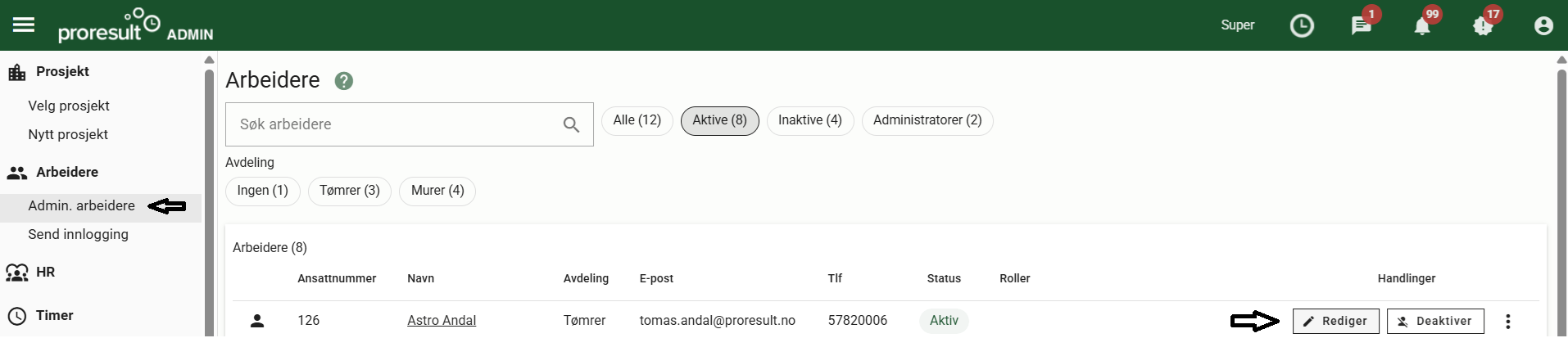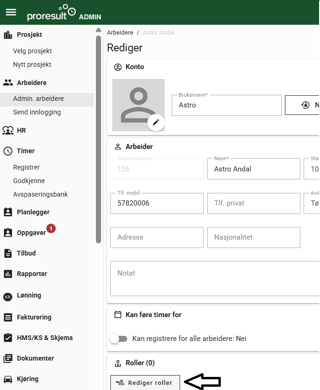 Gå inn på en arbeider via admin. arbeidere. Rediger arbeideren (med redigeringsknappen til høyre) og velg seksjonen for roller,