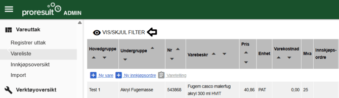 Minimererer søkefeltet som standard i varelisten inne på admin (PC). Du får frem søkefeltet ved å klikke på vis/skjul filter