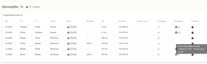 Når en administrator har godkjent en kjøreutgift, vil det ikke lenger være mulig for arbeiderne å endre eller slette en kjøreutgift. Unntak er for teamleder/avdelingsleder, som fortsatt har redigeringsrettigheter.