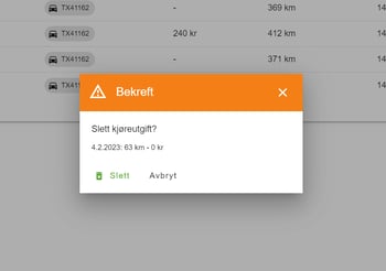 Når du klikker på slett vil en dialog dukke opp og be deg om å bekrefte at kjøreutgiften skal slettes.