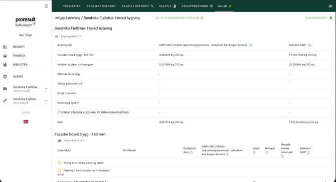 Miljømodulen gir deg samlet oversikt over miljødata og klimagassutslipp for alle varer inkludert i kalkylen. Klimadataene hentes fra NOBB-databasen, der produsentene registrerer klimaopplysninger per vare.