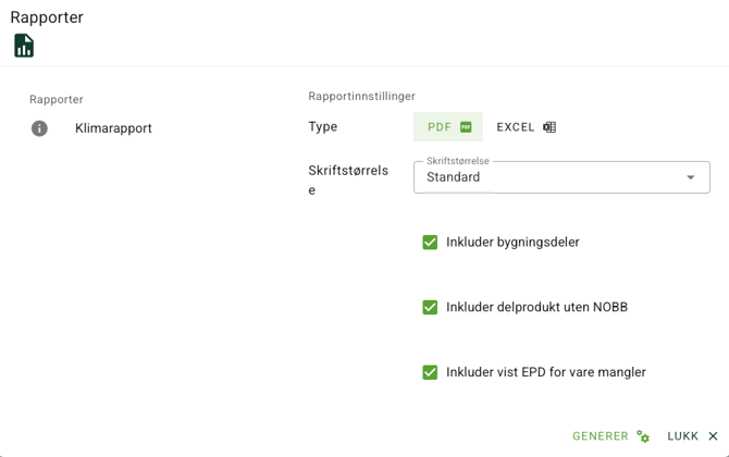 Her får du en samlet visning av relevante miljødata. For å laste ned en klimarapport, trykker du på knappen Klimarapport. Rapporten kan hentes ut i PDF- eller Excel-format.
