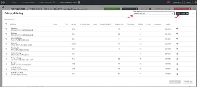 Når du har åpnet ønsket bygningsdel eller element, klikker du på «Oppdater priser». Da åpnes et vindu for prisoppdatering, hvor du kan velge hvilken prisliste du vil bruke som grunnlag. Fortsett deretter til «Hent priser».