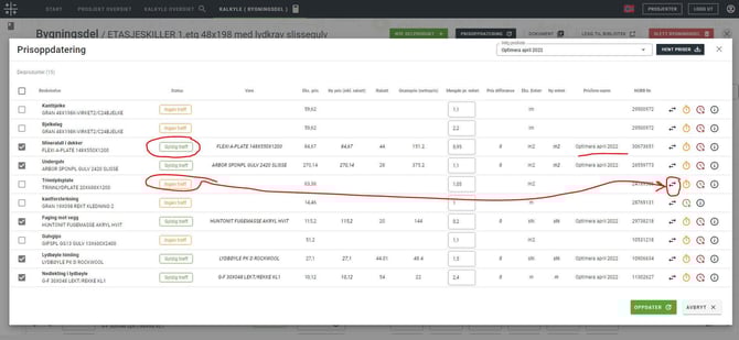 Det er viktig å kontrollere at byggevareprisene er oppdatert til siste prisliste før du fullfører en kalkyle. Vær oppmerksom på at elementer hentet fra biblioteket eller fra tidligere prosjekter kan inneholde utdaterte priser.