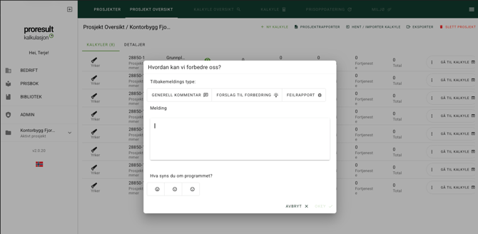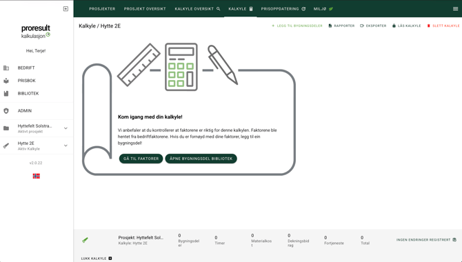 Proresult Kalkulasjon fungerer som før, men med noen mindre justeringer. Du vil oppleve en mer moderne og smidig opplevelse, og fremover vil vi gjøre fortløpende oppdateringer og forbedringer basert på tilbakemeldinger.