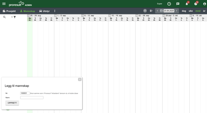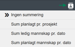 Øverst i planleggeren har du tre ulike valg for visning: prosjekt, mannskap og utstyr.
