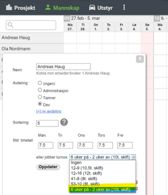 Ved å trykke på arbeideren sitt navn får du opp valg for å endre navn, avdelingstilknytning, timetall per dag og eventuelt turnus-ordning. Mer info om turnus lenger nede.