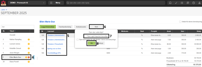 Deretter må en gå gjennom hver ansatt(4), markere alle oppføringene i lønnskjøringen ved å markere en av dem (trykke på bakgrunnen, ikke teksten) og deretter trykke Ctrl+A(5), trykke slett(6), huke av for fjern også importerte lønnslinjer(7) og trykke Ok (8). Gjenta for alle ansatte. Nå skal alle gamle overførte oppføringer være borte.