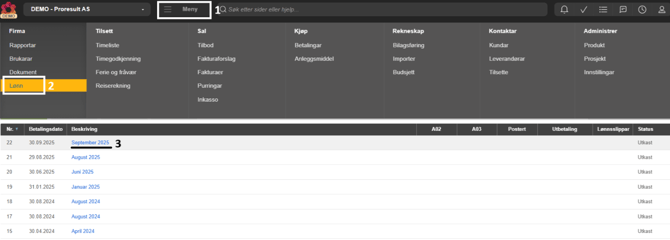 Gå til PoGo og trykke Meny (1) → Lønn (2) og deretter velge lønnskjøringen som er feil (3).