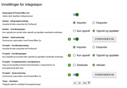 NB! Dersom kunder, ansatte eller prosjekter allerede er registrert i systemet du ønsker å eksportere informasjon til, kan det oppstå duplikater eller feilkoblinger dersom integrasjonen aktiveres. Vi anbefaler at du tar kontakt med Proresult før du aktiverer automatisk overføring, slik at dataene kan kobles korrekt.