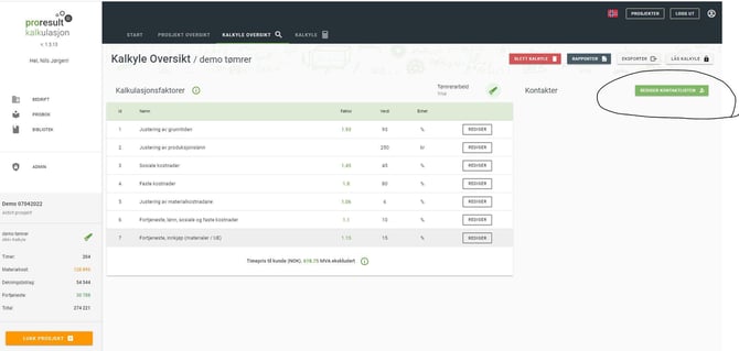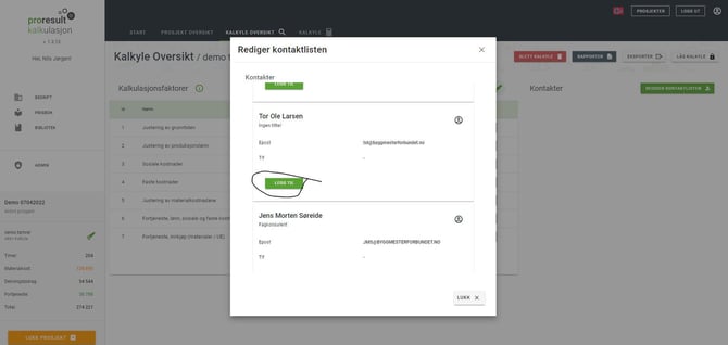 Prosjektkontakter Du kan legge inn prosjektkontakter i kalkyleoversikten. Kontaktene kan hentes fra listen du etablerte under bedrift. Kontaktene kan legges inn i forskjellige kalkulasjonsrapporter. Hvordan legge inn prosjektkontakter