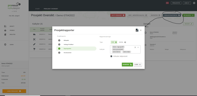 I programmet finner du funksjon for å ta ut prosjektrapporter. Rapportene kan enten tas ut som PDF eller Excelfil. Du velger selv hvilke kalkyler du vil ha med og hva slags informasjon du vil få frem