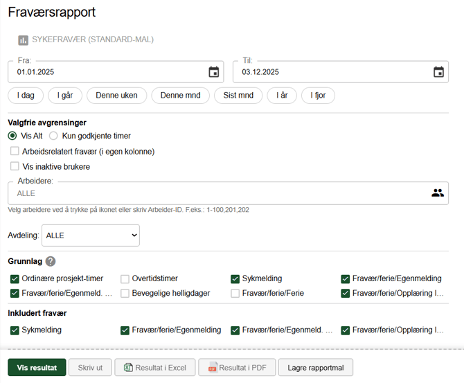 Denne rapporten er også tilgjengelig for arbeiderne. Her kan du lage lister per arbeider med mulighet for ulike avgrensinger og visninger. Rapporten kan skrives ut og lagres som PDF- eller Excel-fil.