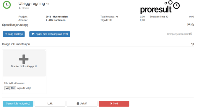 - Velg “legg til med kvitteringstolk” for å legge til bilde/PDF av utlegget og la Proresult sin kvitteringstolk tolke utlegget for deg. Den vil da foreslå utleggstype, tekst og beløp automatisk ut i fra hva den klarer å tolke av kvitteringen.