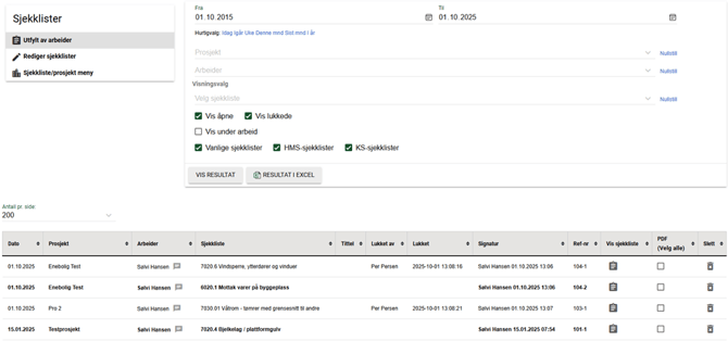 I sjekklistemodulen ligger oversikt over alle utfylte sjekklister, samt søkefunksjon.