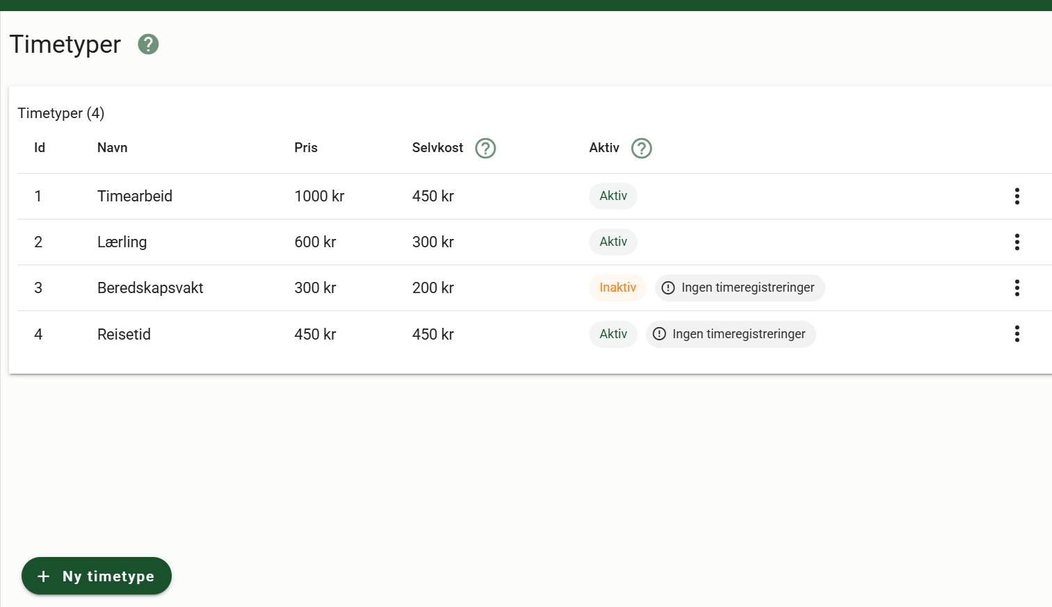 Timetyper benyttes i timeregistreringen for å skille mellom ulike typer arbeid og fakturasatser. På oversiktssiden ser du hvilke priser som gjelder for de ulike timetypene, samt hvilke som er aktivert for andre brukere. Du kan også se timetyper som ikke er i bruk i systemet. Gjennom menyen med tre prikker til høyre kan du redigere, sette timetyper inaktive, endre rekkefølge eller slette dem.