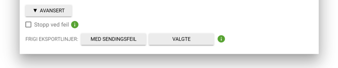 AVANSERT-knappen åpner flere tilleggsverktøy. Ved å huke av for «Stopp ved feil» vil eksporten stanse dersom det oppstår sendingsfeil. Dersom boksen ikke er avhuket, vil systemet forsøke å sende alle linjer uten å stoppe ved feil. Det er også mulig å skille ut linjer – enten valgte linjer eller kun linjer med sendingsfeil – til et eget lønnsgrunnlag.
