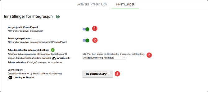 1. Integrasjonen aktiveres ved å trykke på knappen, da vil den være en aktiv integrasjon i Proresult systemet og eksport verktøyene vil være synlige i lønnseksport