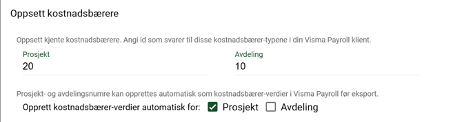 Skal man benytte seg av kostnadsbærere for eksportene, som til eksempel Prosjekt eller Avdeling i Visma Payroll, så må man legge inn tall-IDen man benytter til disse fra Visma Payroll
