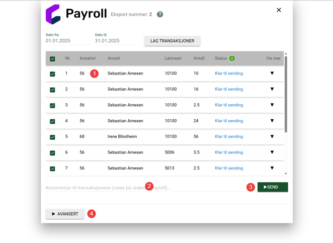 Trykker du "SEND" vil transaksjonene sendes én og én til Visma Payroll.Avansert